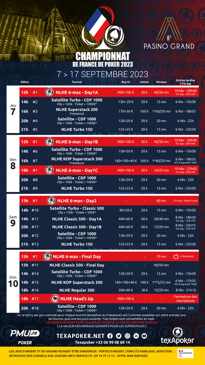 The first edition of the French Poker Championship will take place from 7 to 17 September 2023: the Pasino Grand d'Aix-en-Provence, the most interactive casino in Europe, will host 4 main €1,000 events (8-max, 6-max, HU and PLO) with programmes and structures designed by Texapoker.