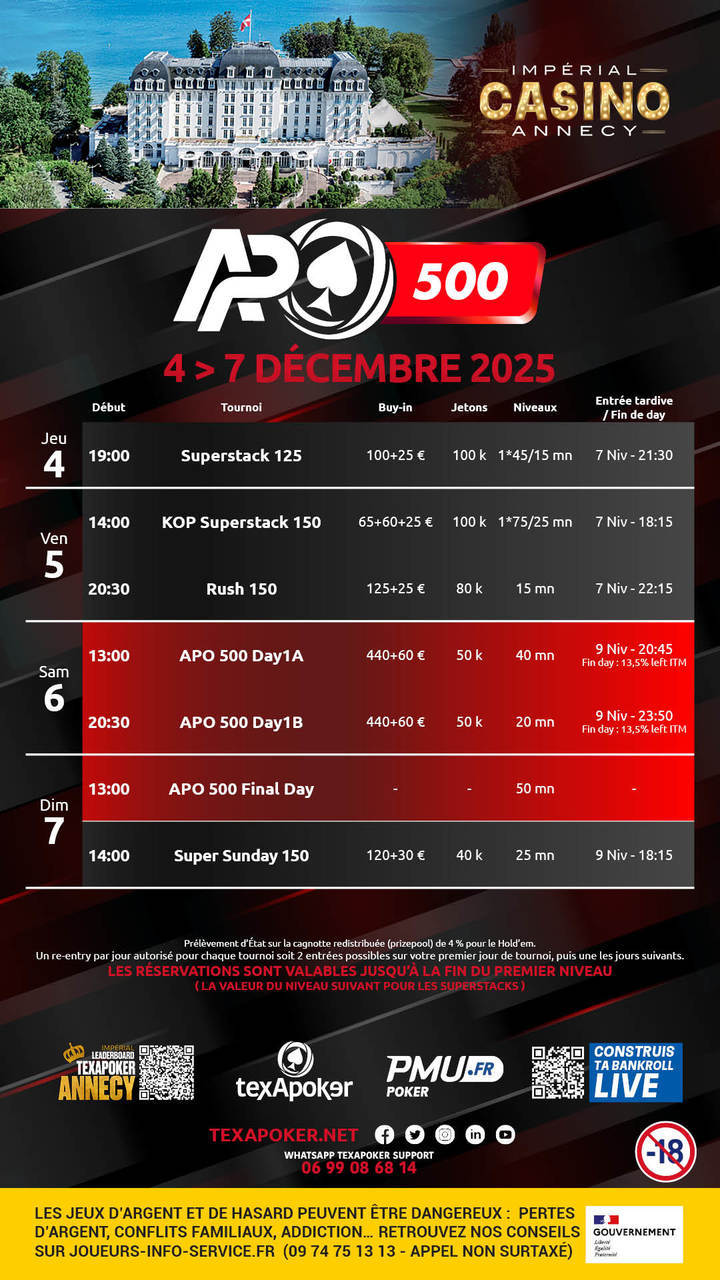 Returning to the Imperial Casino in Annecy, Texapoker brings you the APO 500 with a 2-day structure: