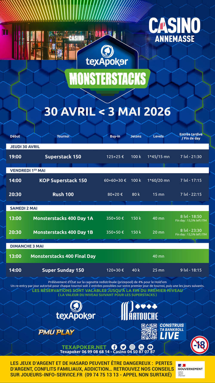 Texapoker is back at the Casino d'Annemasse with the Texapoker Monsterstacks! Tickets won on PMU PLAY can be used in all tournaments.