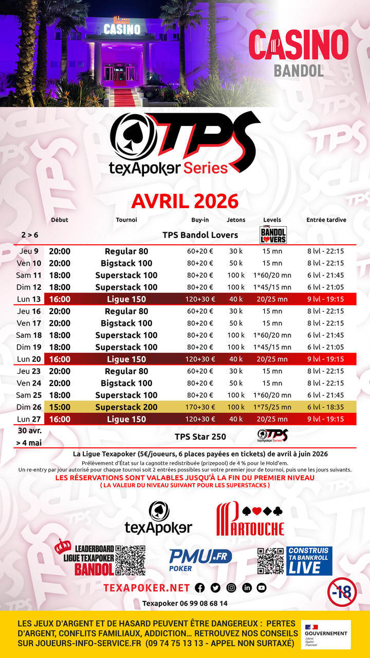 Texapoker, PMU.fr, and the Casino de Bandol present the Texapoker League, the weekly tournaments in Bandol! Tickets won on PMU.fr can be used for all tournaments.