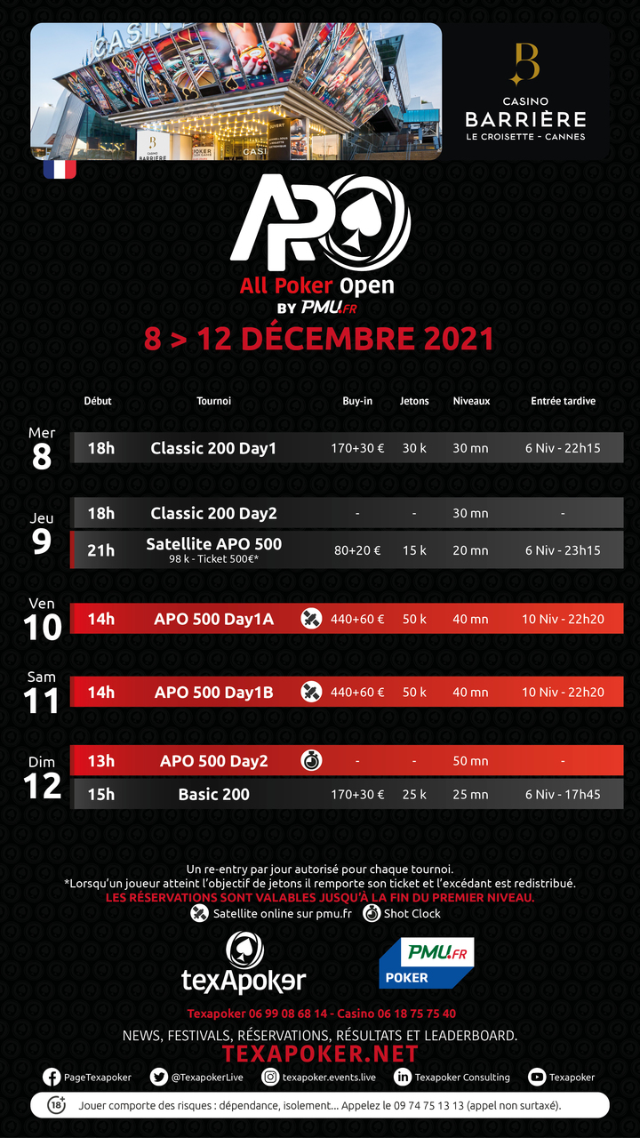 Back in Cannes, Texapoker offers you the APO 500, which will last from Friday to Sunday! In addition to a main event, you can find a Classic 200 to open the festival, and a Basic 200 to close the festival.