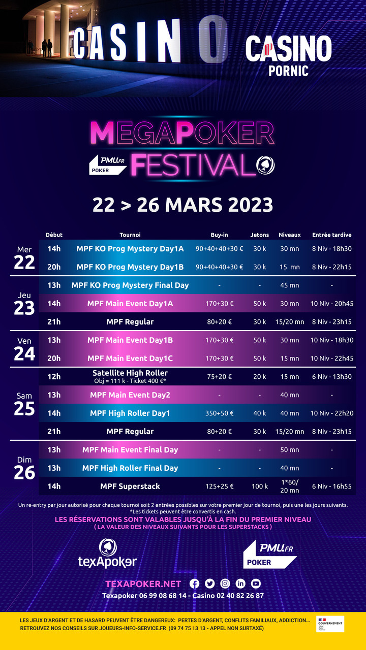 Texapoker, PMU.fr and the Casino de Pornic are proud to announce the return of the Megapoker Festival!