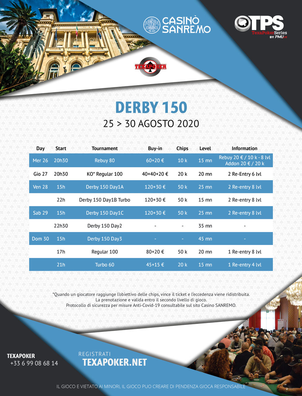 Discover our new format, the Derby 150 for the resumption of poker tournaments in Italy! A Regular 100 and a Turbo 60 will also be available during this festival.