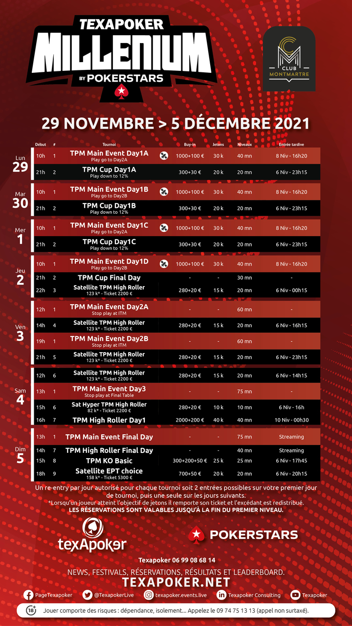 Texapoker is pleased to invite you to the Club Montmartre Paris from November 29 to December 5 for the Texapoker Millenium festival event, sponsored by PokerStars.