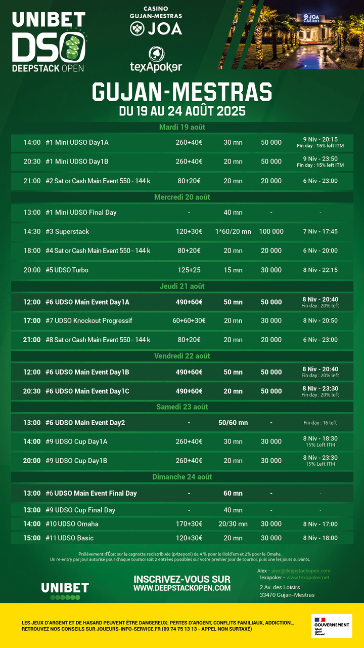 The Unibet DeepStack Open is back at the Casino JOA de Gujan-Mestras for its summer leg, still in partnership with Texapoker!