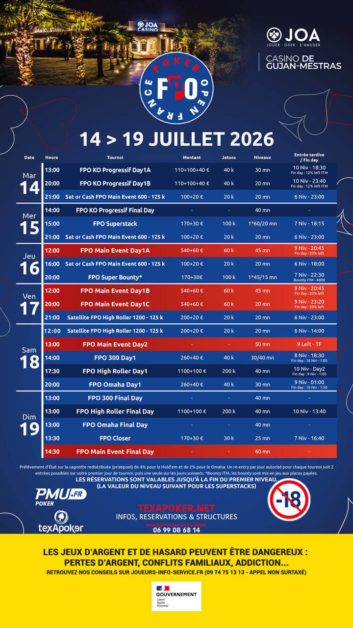 The France Poker Open by PMU PLAY and Texapoker continues in 2025 and the next stage will take place at the casino JOA de Gujan-Mestras !