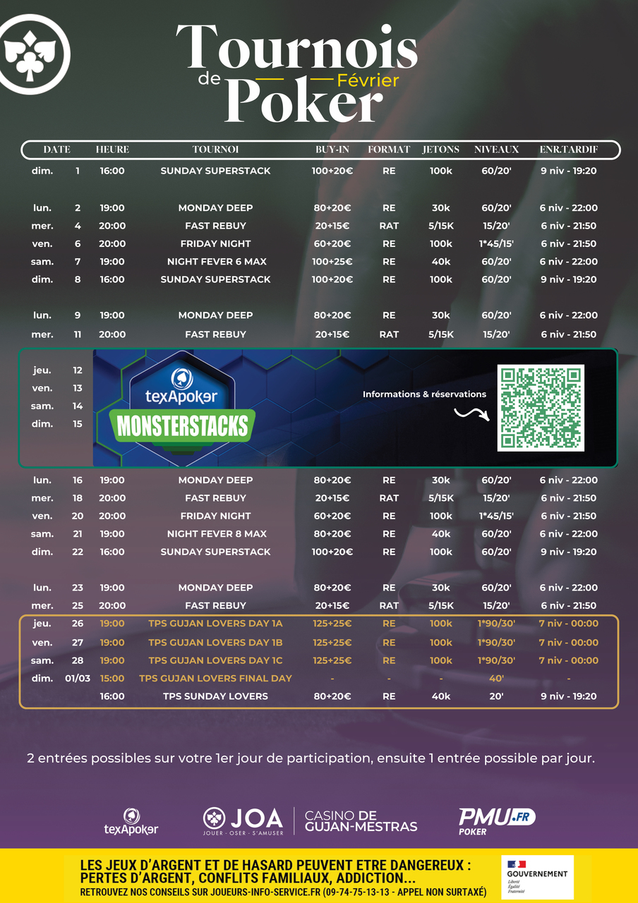 Find out all the information about your weekly tournaments at the JOA casino in Gujan-Mestras!