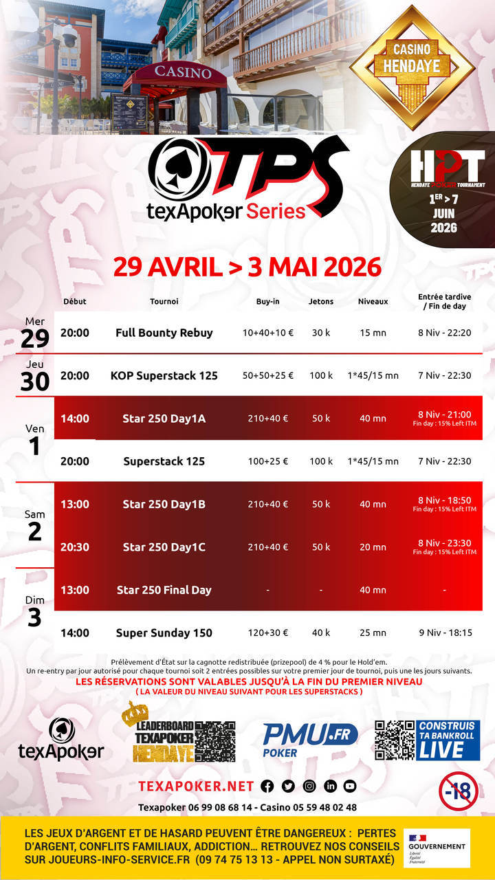 The TPS are back at the casino d'Hendaye ! As with all TPS tournaments, tickets won on PMU.fr can be used for all tournaments.