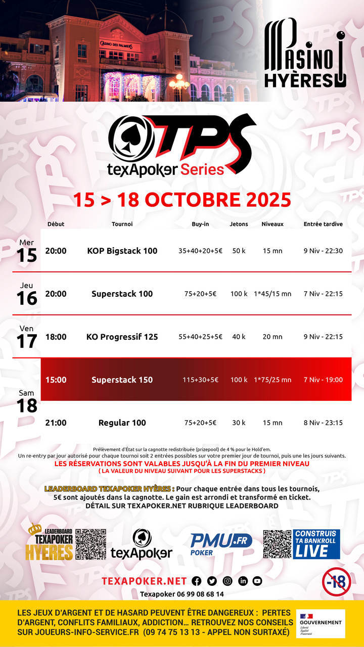 TPS is the hallmark of Texapoker! As with all TPS tournaments, tickets won on PMU.fr can be used for all tournaments.