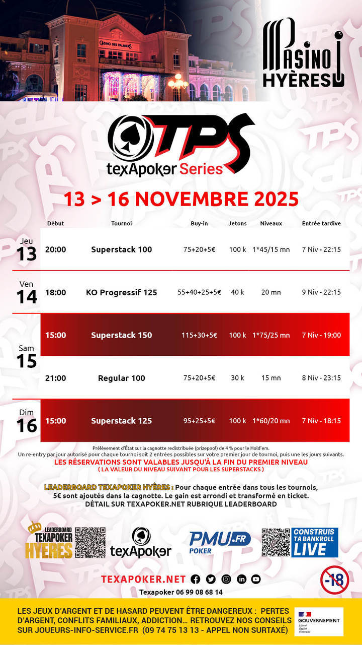 TPS is the hallmark of Texapoker! As with all TPS tournaments, tickets won on PMU.fr can be used for all tournaments.