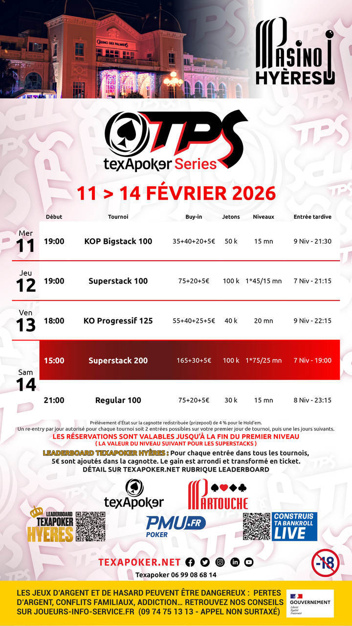 TPS is the hallmark of Texapoker! As with all TPS tournaments, tickets won on PMU.fr can be used for all tournaments.