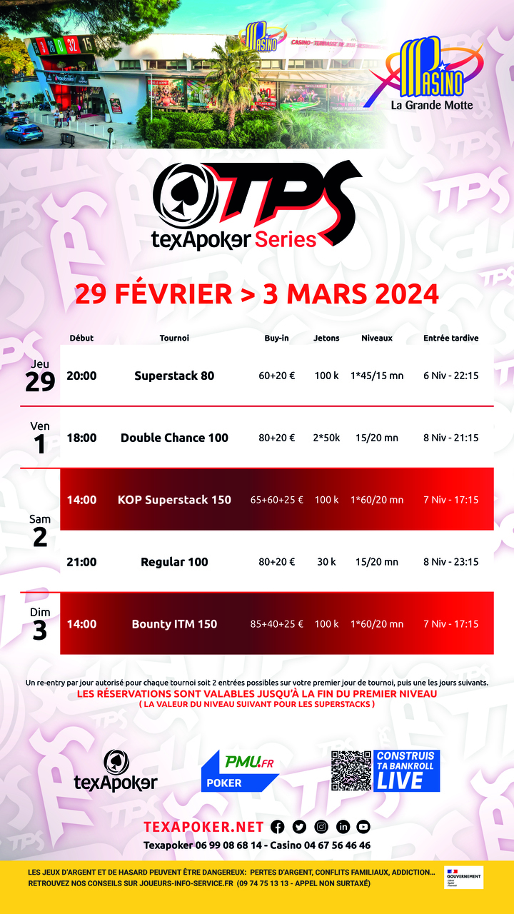 TPS is Texapoker's trademark! In partnership with PMU.fr, tickets won on PMU.fr can be used in all tournaments.