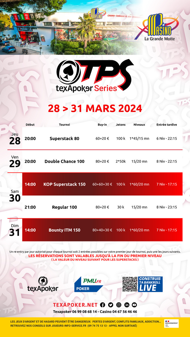 TPS is Texapoker's trademark! In partnership with PMU.fr, tickets won on PMU.fr can be used in all tournaments.