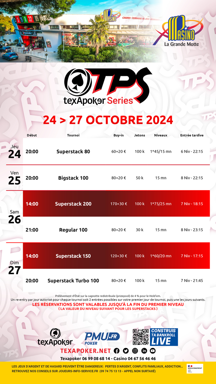 This week at the Pasino de La Grande Motte, come play a SuperStack 80, a Bigstack 100, a Superstack 200, a Bounty ITM 150 as well as a Regular 100.