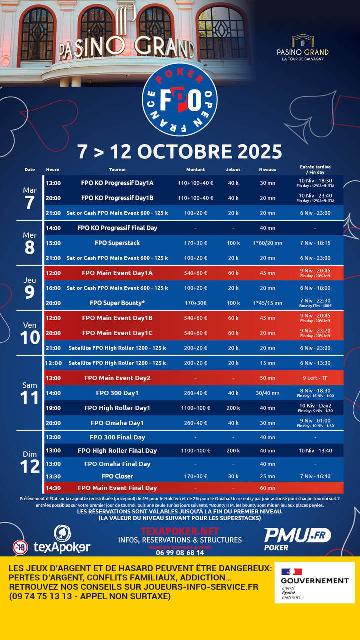 The France Poker Open by PMU.fr and Texapoker continues in 2025 and the next stage will take place at the Pasino Grand La Tour-de-Salvagny !