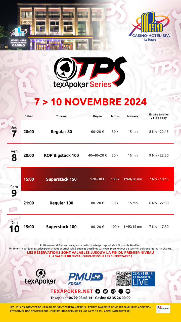 The TPS is Texapoker's trademark! As with all TPS tournaments, tickets won on PMU.fr can be used for all tournaments.