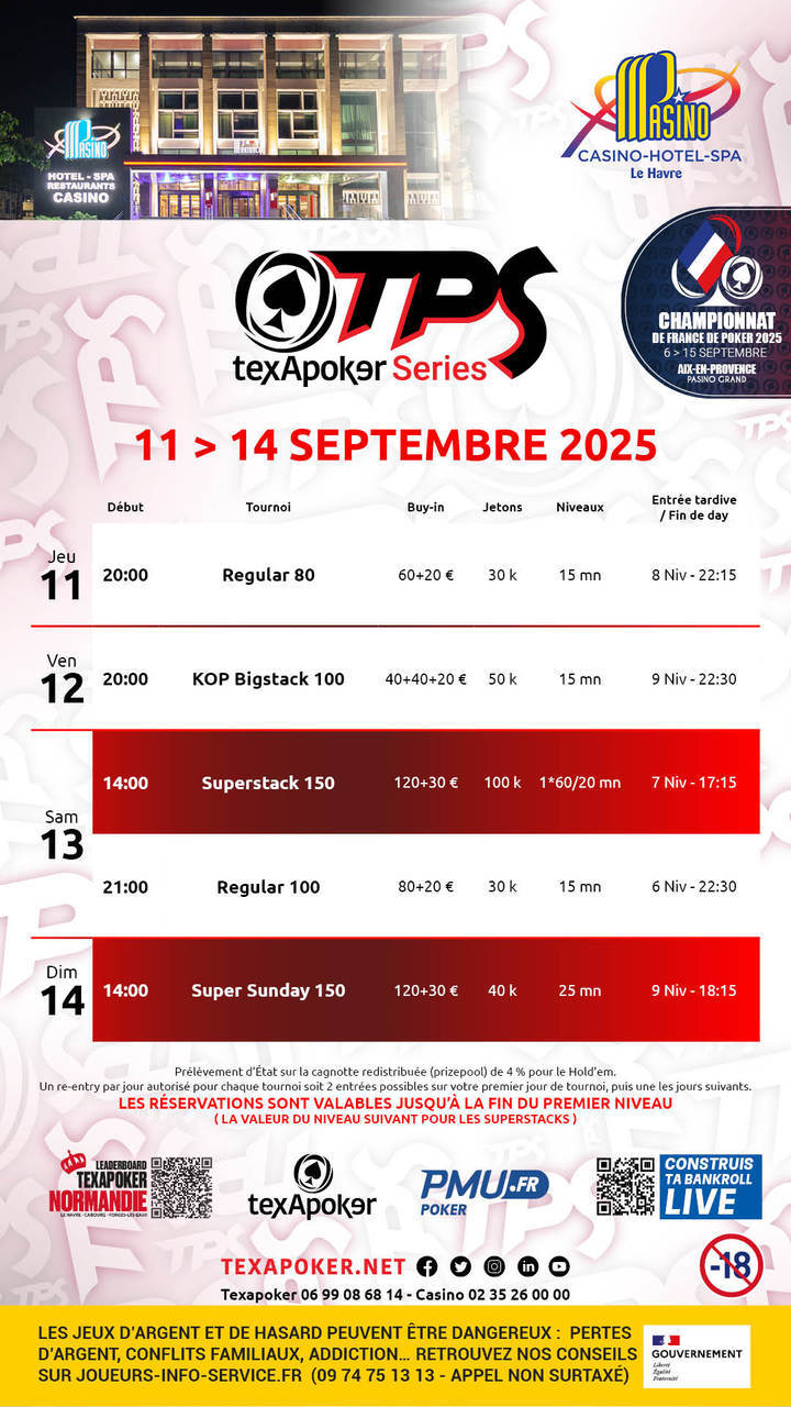 The TPS is Texapoker's trademark! As with all TPS tournaments, tickets won on PMU.fr can be used for all tournaments.