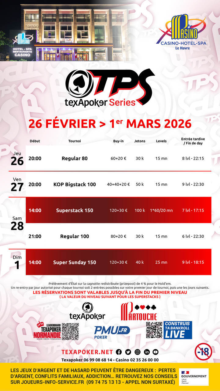 The TPS is Texapoker's trademark! As with all TPS tournaments, tickets won on PMU.fr can be used for all tournaments.