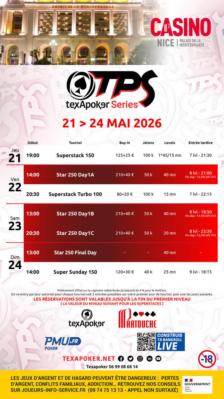 TPS is Texapoker's trademark! In partnership with PMU PLAY, tickets won on PMU PLAY can be used in all tournaments.