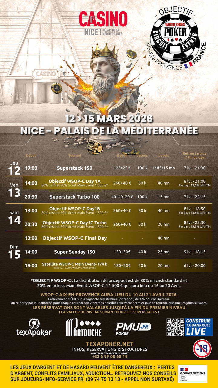 Following last year's success, the WSOP-C is back at the Pasino Grand in Aix-en-Provence, and will take place from 10 to 21 April in partnership with PMU.fr! Texapoker and the Casino de Nice Palais de la Méditerranée are offering you the chance to qualify for the Main Event thanks to the Objectif WSOP-C festival!