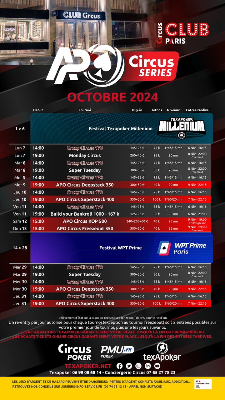 Every Monday you'll find the Monday Circus, the Super Tuesday on Tuesday, an APO Circus Superstack 400 on Wednesday, an APO Circus Superstack 300 on Thursday, an APO Circus sat pack 1500 on Friday, an APO Circus Bounty ITM 500 on Saturday, and an APO Circus €300 on Sunday.