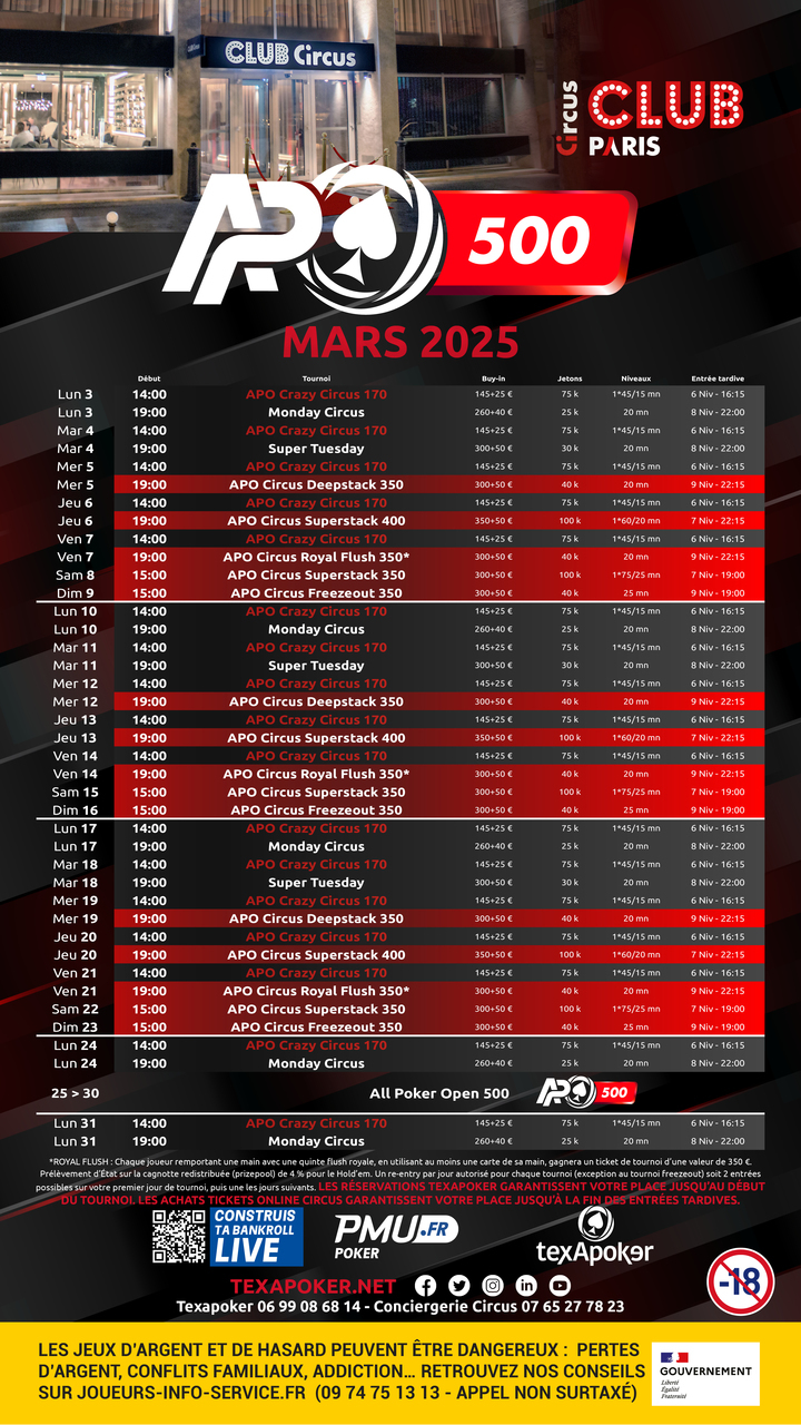 Texapoker and the Circus Club present their regular tournaments, the APO Circus Series!