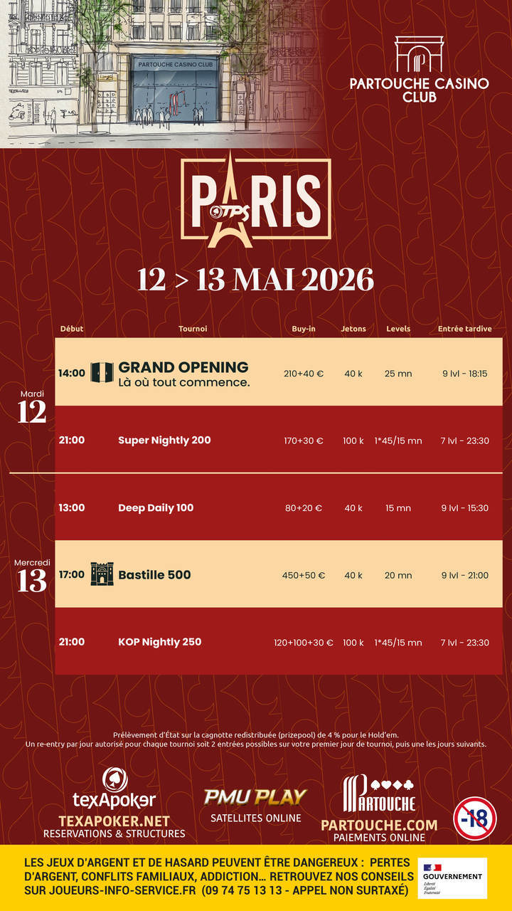 It kicks off with the €300 Grand Opening, featuring a 40,000-chip stack to build on 25-minute levels! You’ll also find the €200 Super Nightly, the €100 Deep Daily, the €250 KOP Nightly and the €500 Bastille!