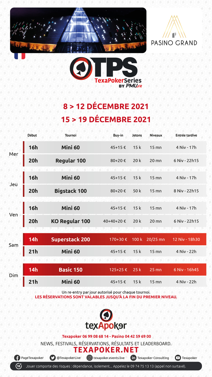 TexaPoker, PMU.fr and the Pasino Grand d'Aix-en-Provence present the weekly tournaments!