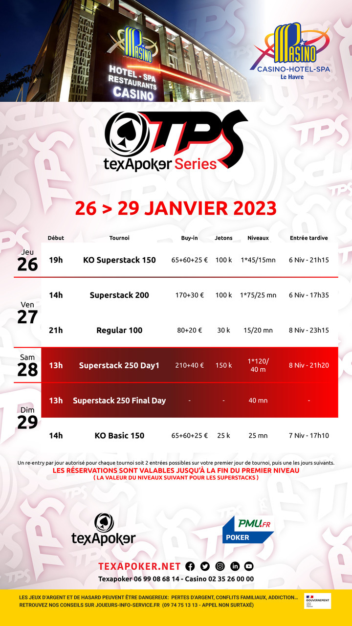 TPS is the trademark of Texapoker! In partnership with PMU.fr, you can try to win your place in Texapoker live tournaments on one of their online satellites.