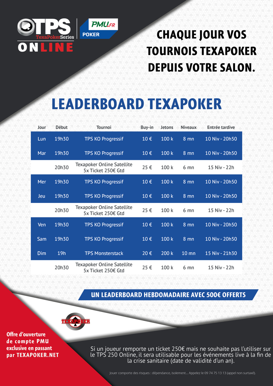 Texapoker and PMU Poker are teaming up once again to bring you TexaPoker Series Online. While our live tournaments are forced to stop due to the health situation linked to COVID-19, poker should not stop. This is why you can now find your favorite tournaments on PMU.fr.
