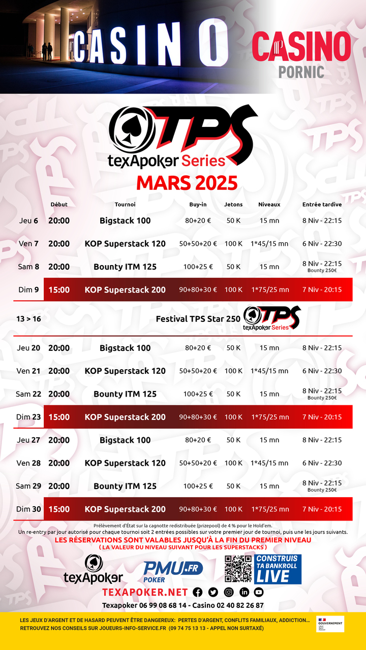 TPS is Texapoker's trademark! Just like in all TPS tournaments, tickets won on PMU.fr can be used for any of the tournaments.