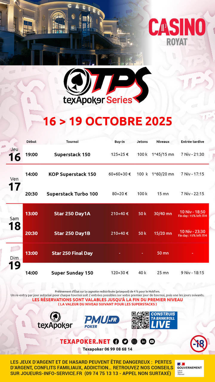 Finally, back at the Royat casino, you'll find the Star 250, Texapoker's flagship tournament, as well as a Superstack 150, a KO Progressive 150, a Regular 100 and a Super Sunday 150.