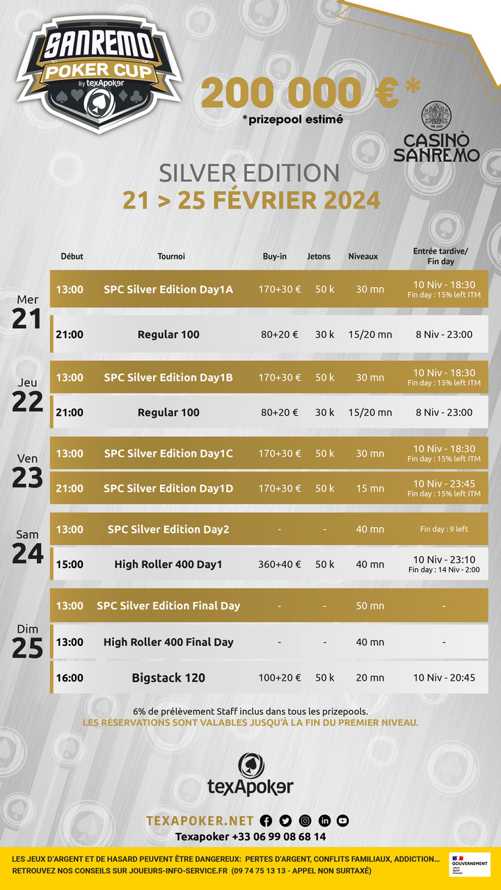 This week's Main Event features the €200 Sanremo Poker Cup, with 4 Day 1s, a starting stack of 50,000 chips and levels of 30, 40 and 50! There will also be a number of side tournaments, including a Regular 100, a High Roller 400 and a Bigstack 120.