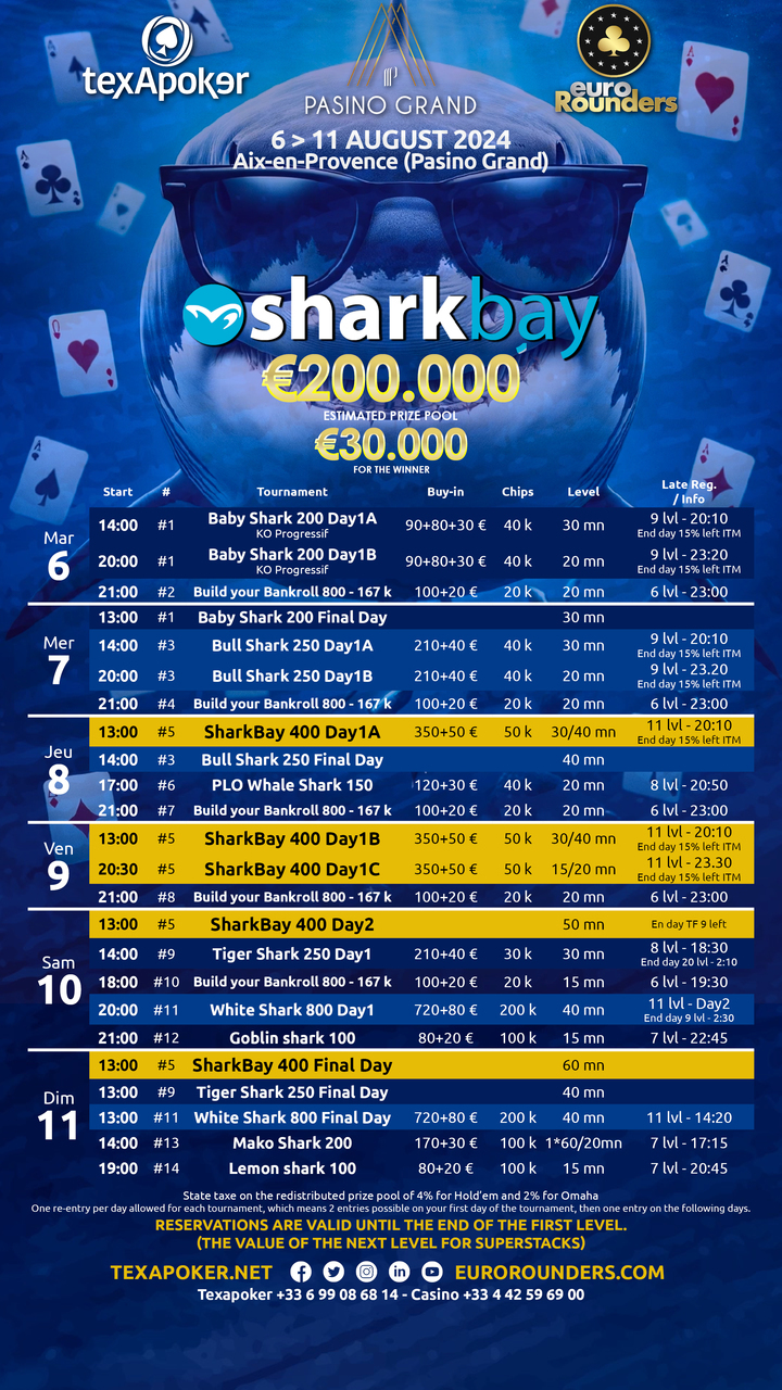 ¡Texapoker lanza el festival SharkBay en Aix-en-Provence y refuerza su asociación con EuroRounders! Esta primera edición del festival tendrá lugar del 6 al 11 de agosto en el Pasino Grand de Aix-en-Provence.