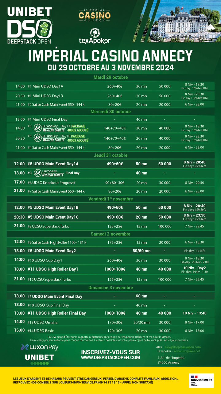 El Evento Principal de 550 euros irá acompañado de una serie de torneos y satélites que le permitirán ganar su asiento. Una Mini UDSO para abrir el baile, así como una UDSO High Roller 1100 y una UDSO Cup. También está el Luxon Pay Mystery Bounty, ¡con un paquete añadido valorado en 4.000 $! Para redondear el festival, ¡un Omaha y un Basic se unirán a la fiesta!