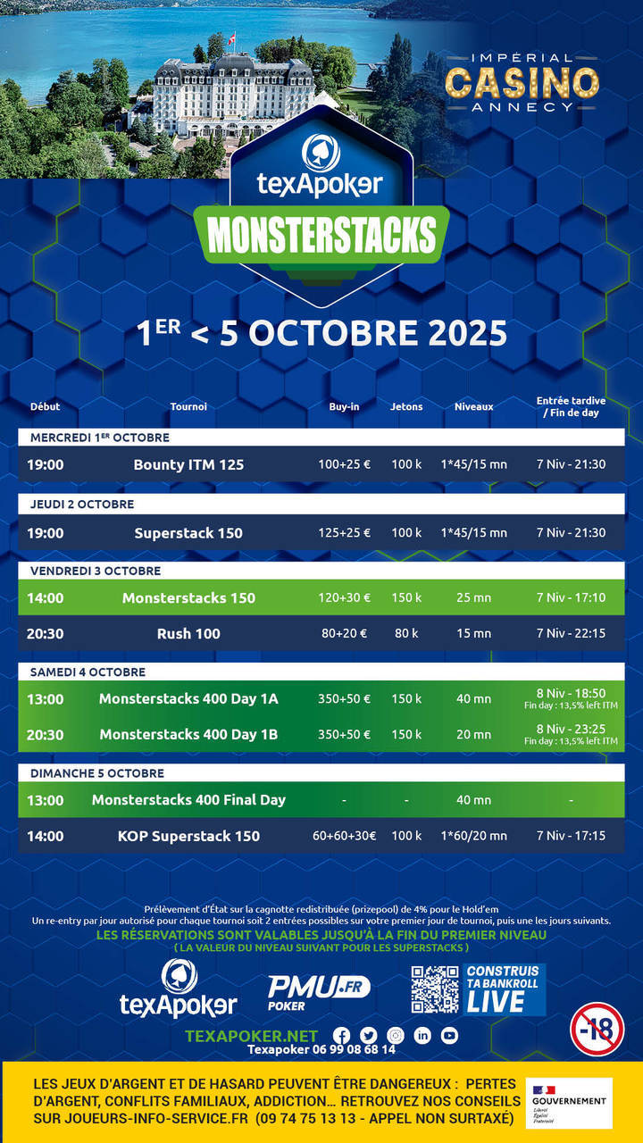 ¡Texapoker vuelve al imperial Casino d'Annecy con los Texapoker Monsterstacks! Las entradas ganadas en PMU.fr se pueden utilizar en todos los torneos.