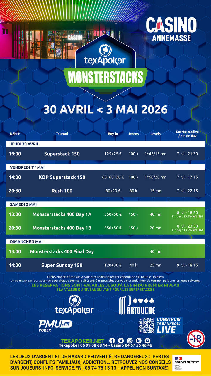 ¡Texapoker vuelve al Casino d'Annemasse con los Texapoker Monsterstacks! Las entradas ganadas en PMU.fr se pueden utilizar para todos los torneos.