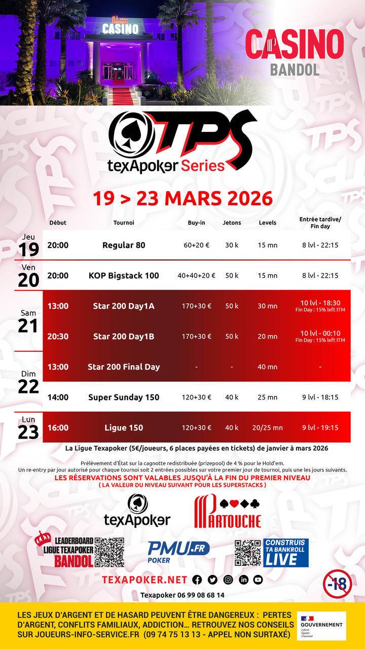 ¡Los torneos TPS son el sello distintivo de Texapoker! Al igual que en todos los torneos TPS, los tickets ganados en PMU.fr se pueden utilizar en todos los torneos.