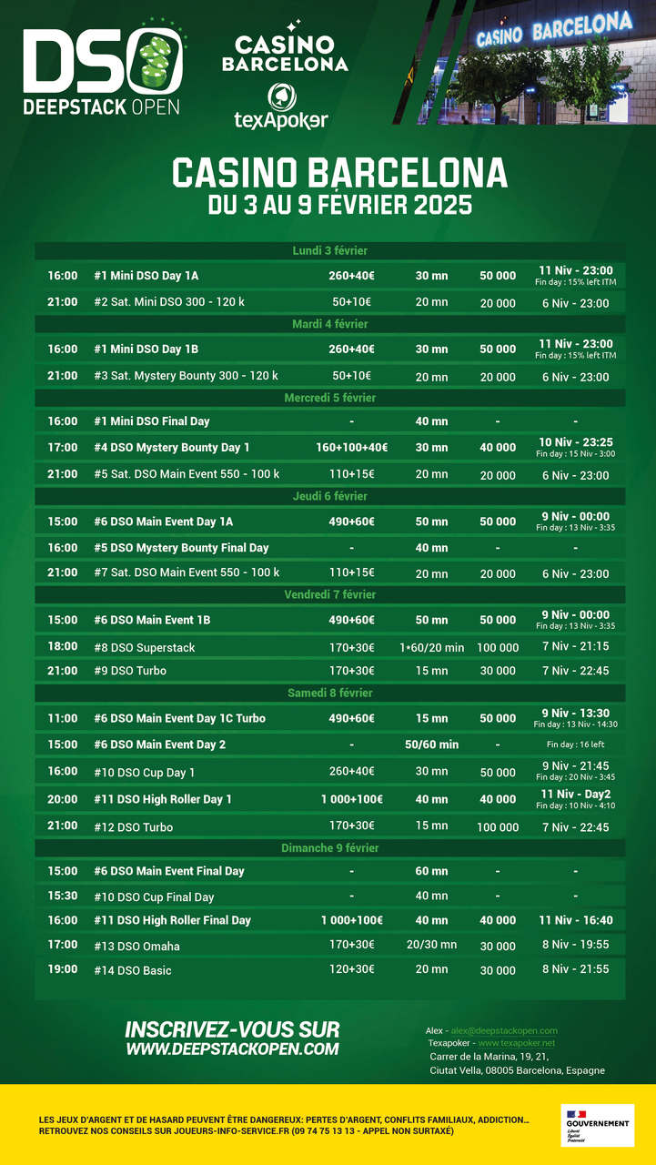 El Evento Principal de 550€ irá acompañado de una serie de torneos y satélites que te darán la oportunidad de ganar tu asiento. Un Mini DSO dará el pistoletazo de salida, al igual que un DSO High Roller 1100 y un DSO Cup 300. ¡Para redondear el festival, un Omaha y un Basic se unirán a la fiesta!