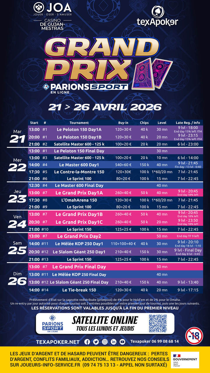 La siguiente etapa de este nuevo circuito se celebrará del 21 al 26 de abril de 2026 en el Casino JOA Gujan-Mestras durante seis días, con un Main Event con una entrada de 300 euros. Basándose en su probada experiencia, los equipos de Texapoker han construido cada evento en torno a un programa rico y variado que ofrece torneos para todos los jugadores con estructuras de calidad.