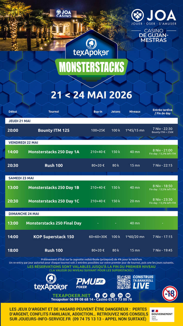 ¡Texapoker vuelve al Casino JOA de Gujan-Mestras con los Texapoker Monsterstacks! Las entradas ganadas en PMU.fr se pueden utilizar en todos los torneos.