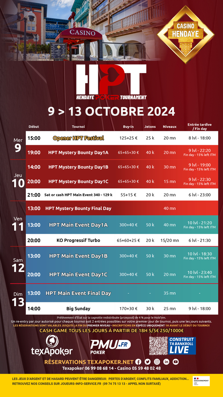 ¡Texapoker regresa al Casino d'Hendaye con el Hendaye Poker Tournament! Al igual que en todos los torneos TPS, los tickets ganados en PMU.fr se pueden utilizar en todos los torneos.