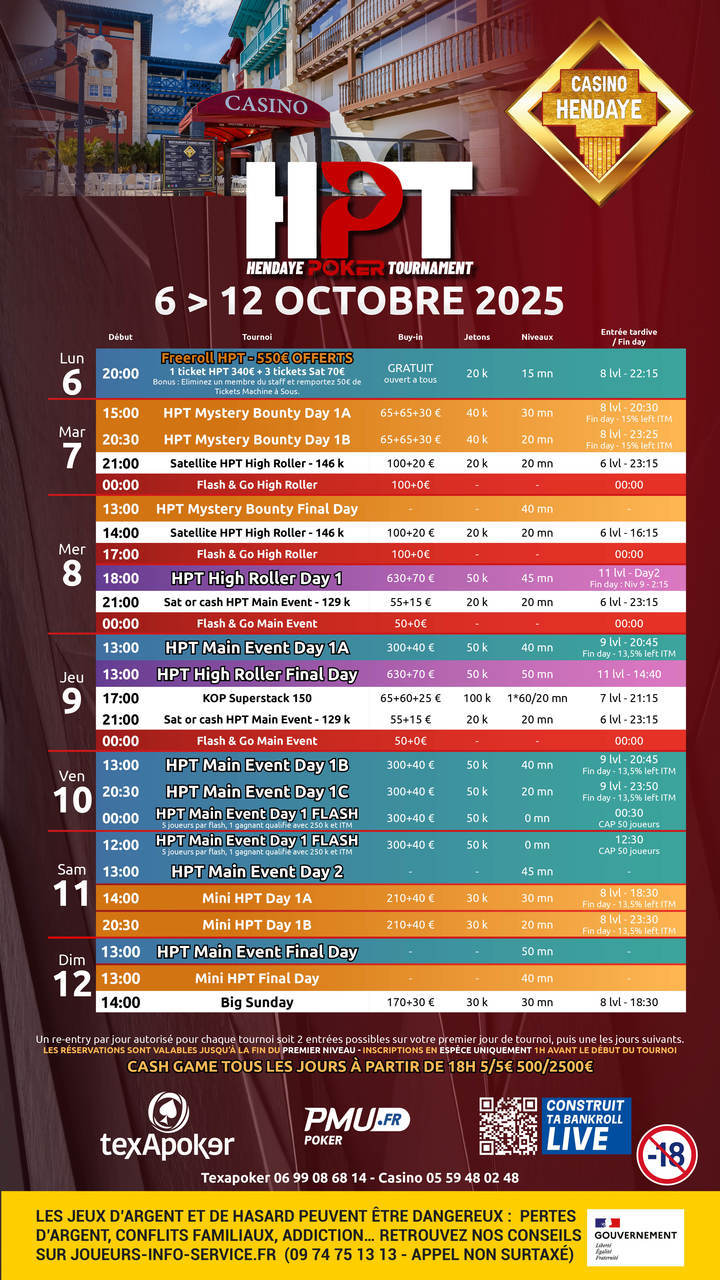¡Texapoker regresa al Casino d'Hendaye con el Hendaye Poker Tournament! Al igual que en todos los torneos TPS, los tickets ganados en PMU.fr se pueden utilizar en todos los torneos.