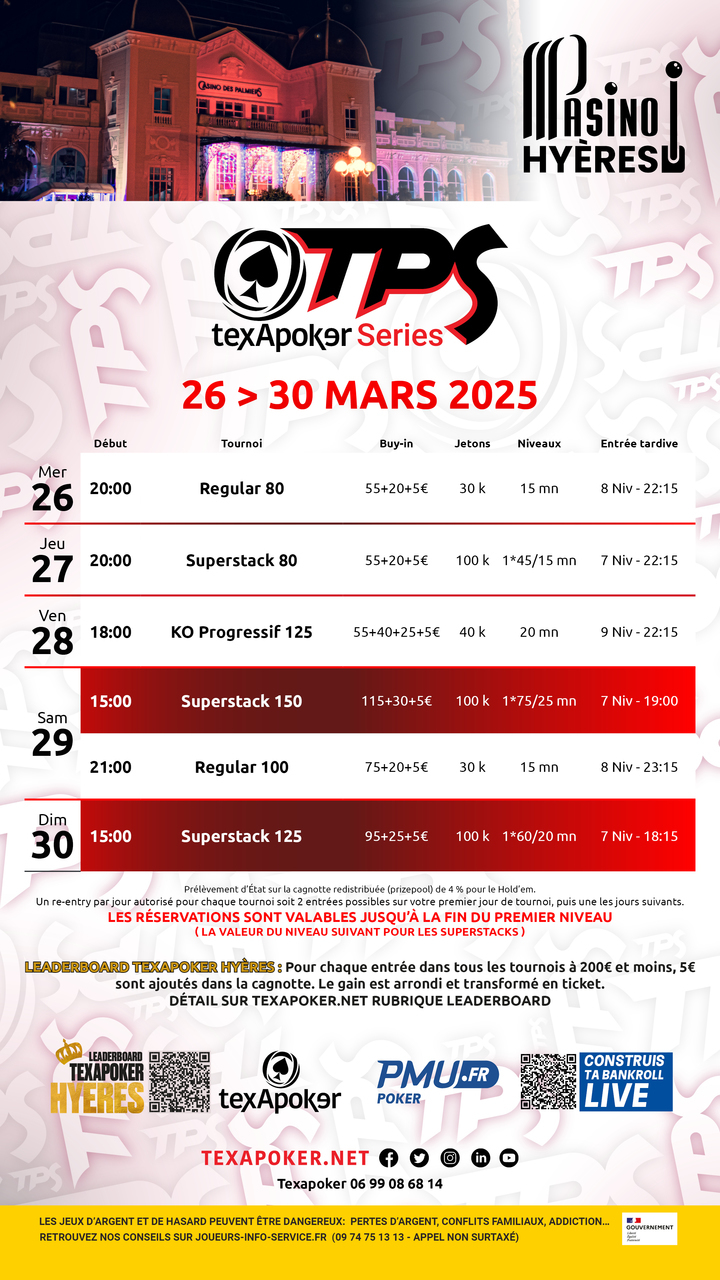 ¡TPS es la marca de Texapoker! Al igual que en todos los torneos TPS, los tickets ganados en PMU.fr se pueden utilizar en todos los torneos.