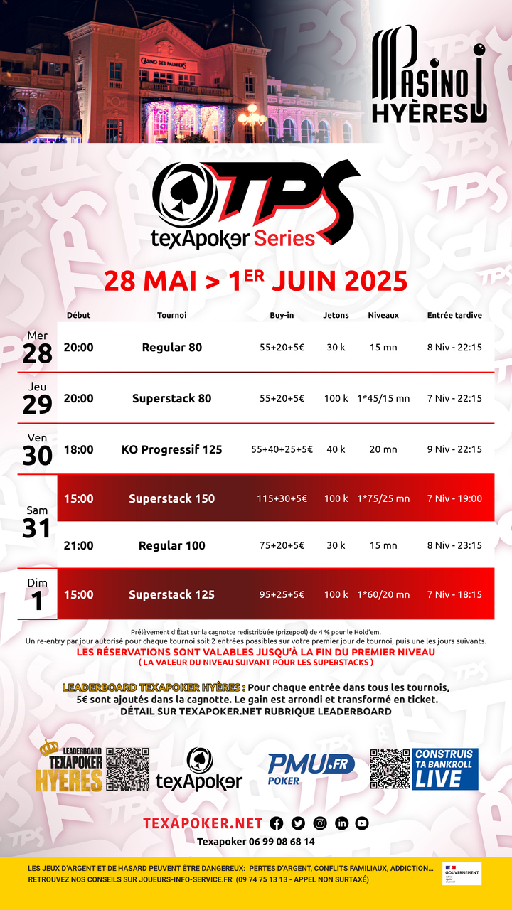 ¡TPS es la marca de Texapoker! Al igual que en todos los torneos TPS, los tickets ganados en PMU.fr se pueden utilizar en todos los torneos.