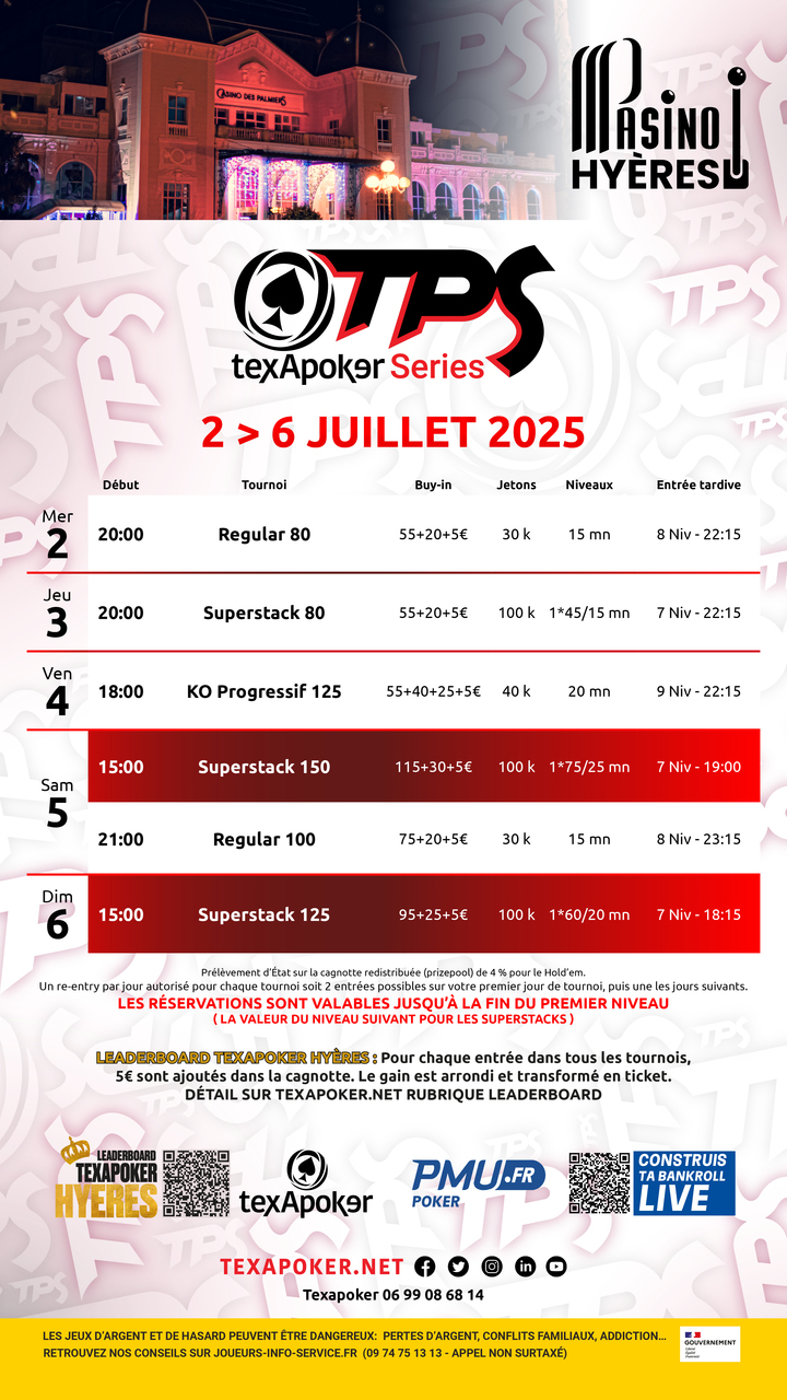 ¡TPS es la marca de Texapoker! Al igual que en todos los torneos TPS, los tickets ganados en PMU.fr se pueden utilizar en todos los torneos.