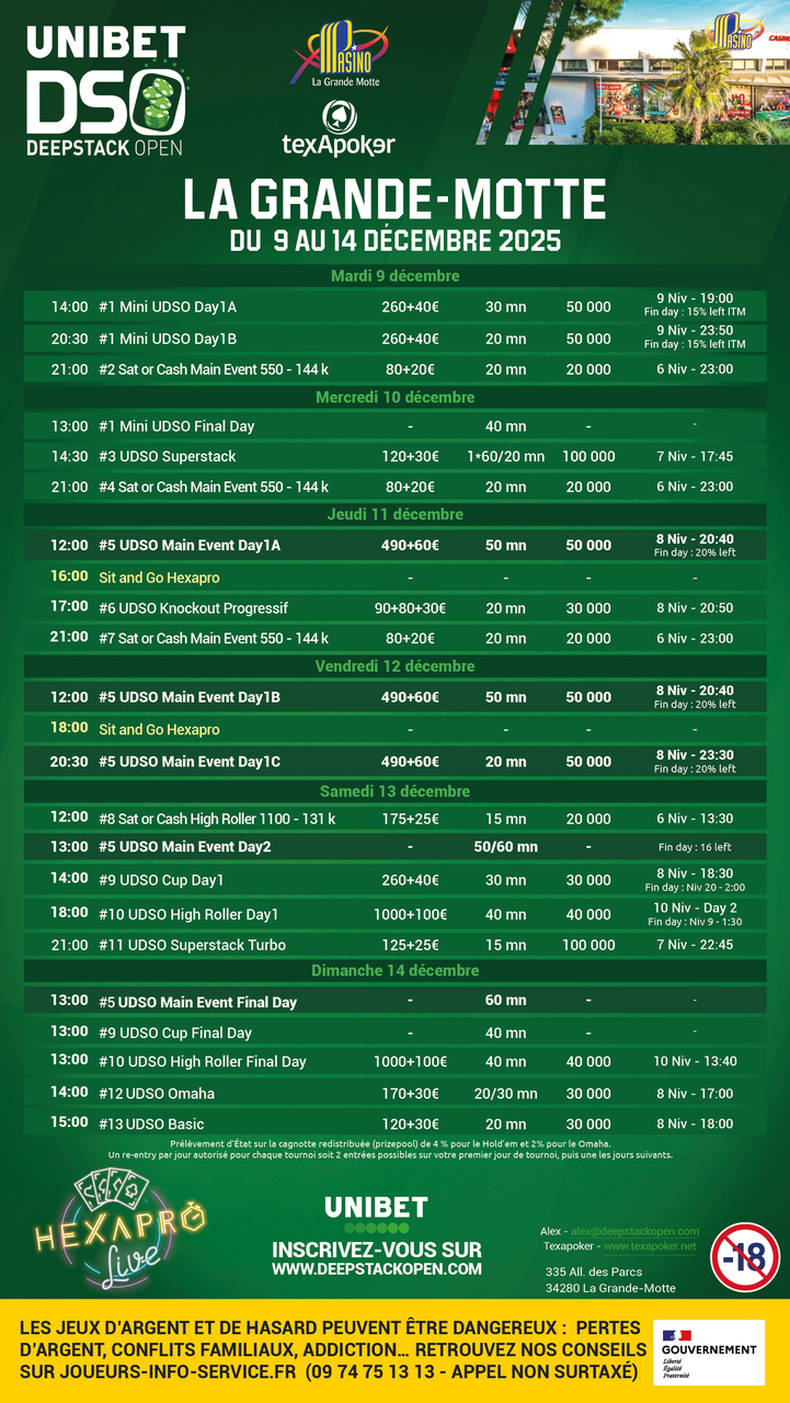 No te pierdas el Main Event de 550 €, que irá acompañado de numerosos torneos y satélites que te permitirán ganar tu plaza. Un Mini UDSO para abrir el baile, así como un UDSO High Roller 1100 y una UDSO Cup. Para cerrar el festival, ¡un Omaha y un Basic se unirán a la fiesta!