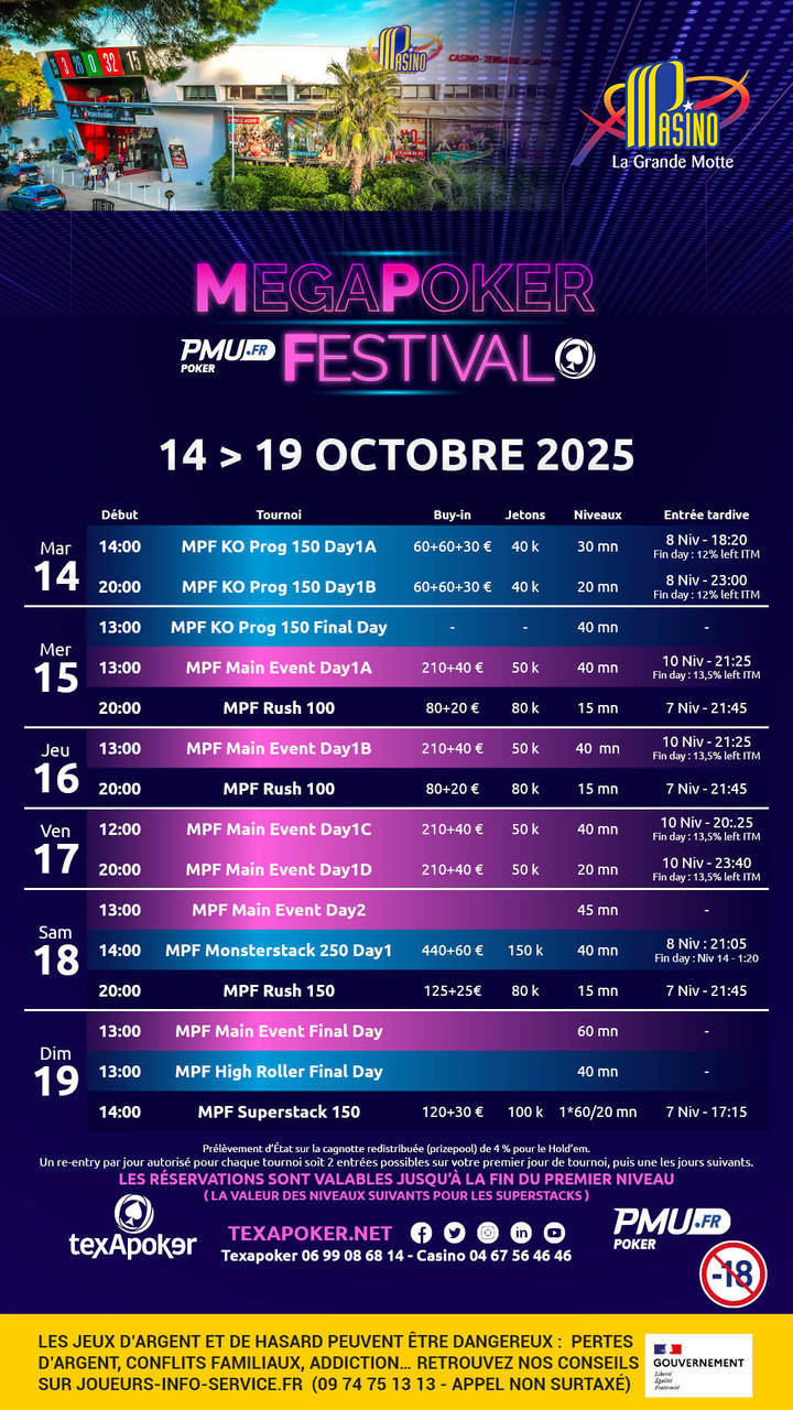 Texapoker, PMU.fr y el Pasino de La Grande-Motte se enorgullecen de anunciar el regreso del MegaPoker Festival.