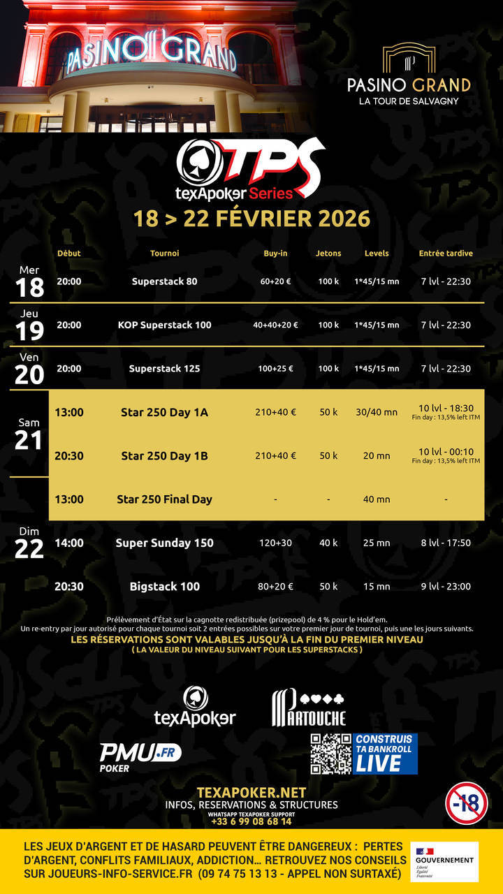 En el Pasino Grand de La Tour-de-Salvagny se celebra el Star 250, el torneo estrella de Texapoker, así como un Superstack 80, un KOP Superstack 100 y un Superstack 125. Para cerrar el festival, ¡un Super Sunday 150 acompañado de un Bistack 100!