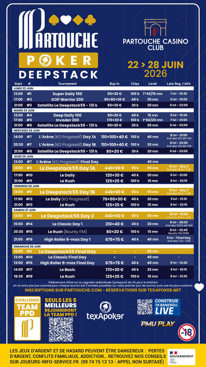 ¡Disfruta del Main Event, el Deepstack55 de 500 €, con sus niveles de 55 minutos y su stack inicial de 55 000 fichas! Paralelamente, se organizarán varios torneos paralelos, entre los que destacan, como apertura del festival, el Arène, un torneo en formato KOP de 250 €, y torneos Rush de 150 €. Para poner el broche final a este magnífico evento, ¡también habrá un Classic de 250 €, un High Roller de 750 € y un Basic de 200 €!